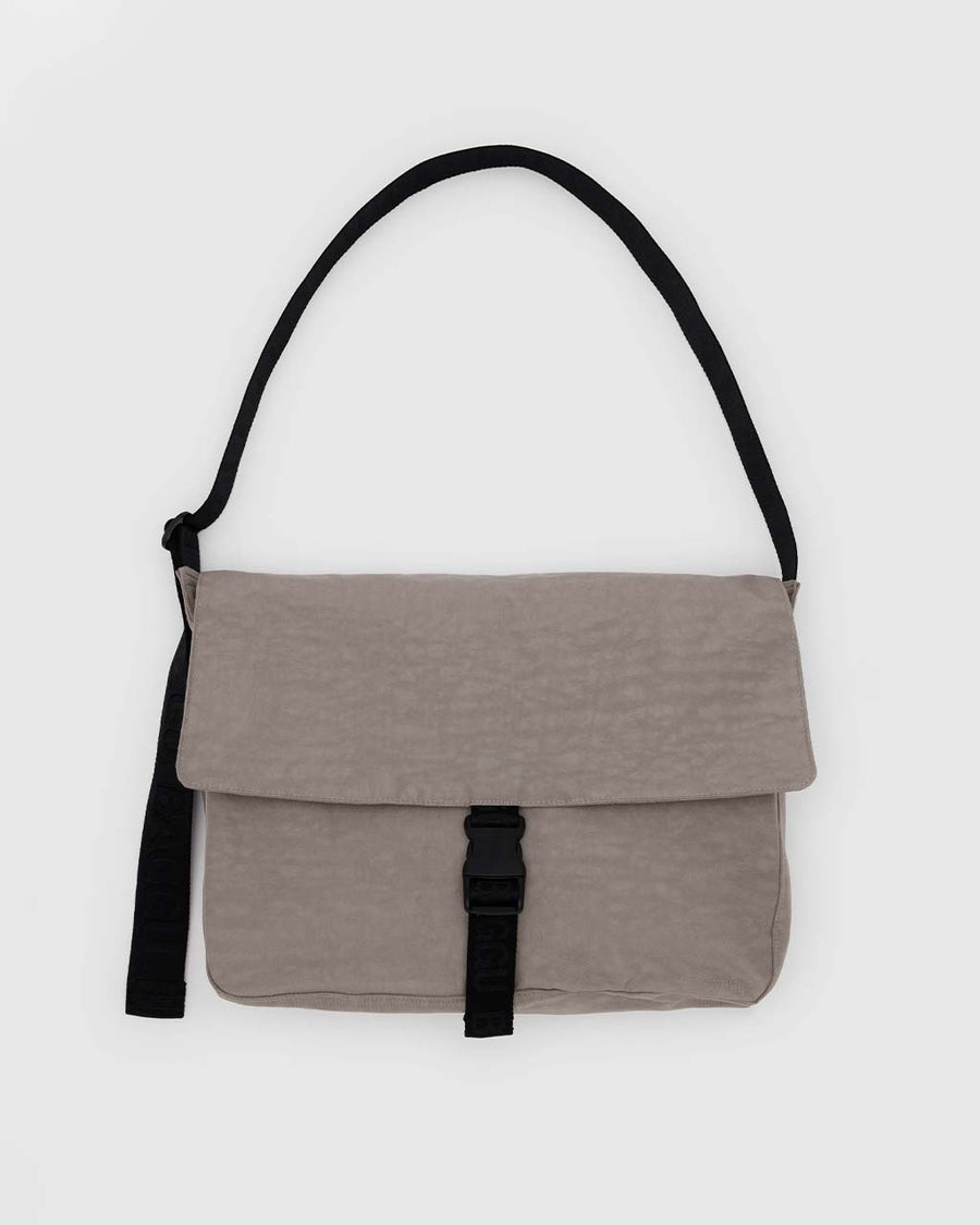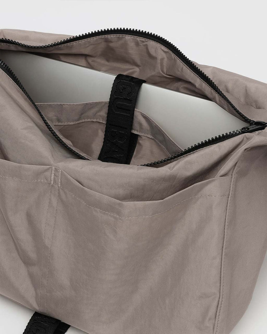 A functional, go-to bag with two large exterior pockets in addition to the main interior compartment. Has an interior laptop sleeve with velcro closure that fits 13/14” laptop in a puffy case.
