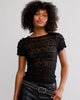 - Features: Lace and mesh fabrication, striped pattern, short sleeves, crew neckline, scalloped trim