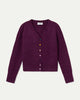 • Burgundy knit cardigan with a V-neck and long sleeves with slightly dropped shoulders.