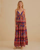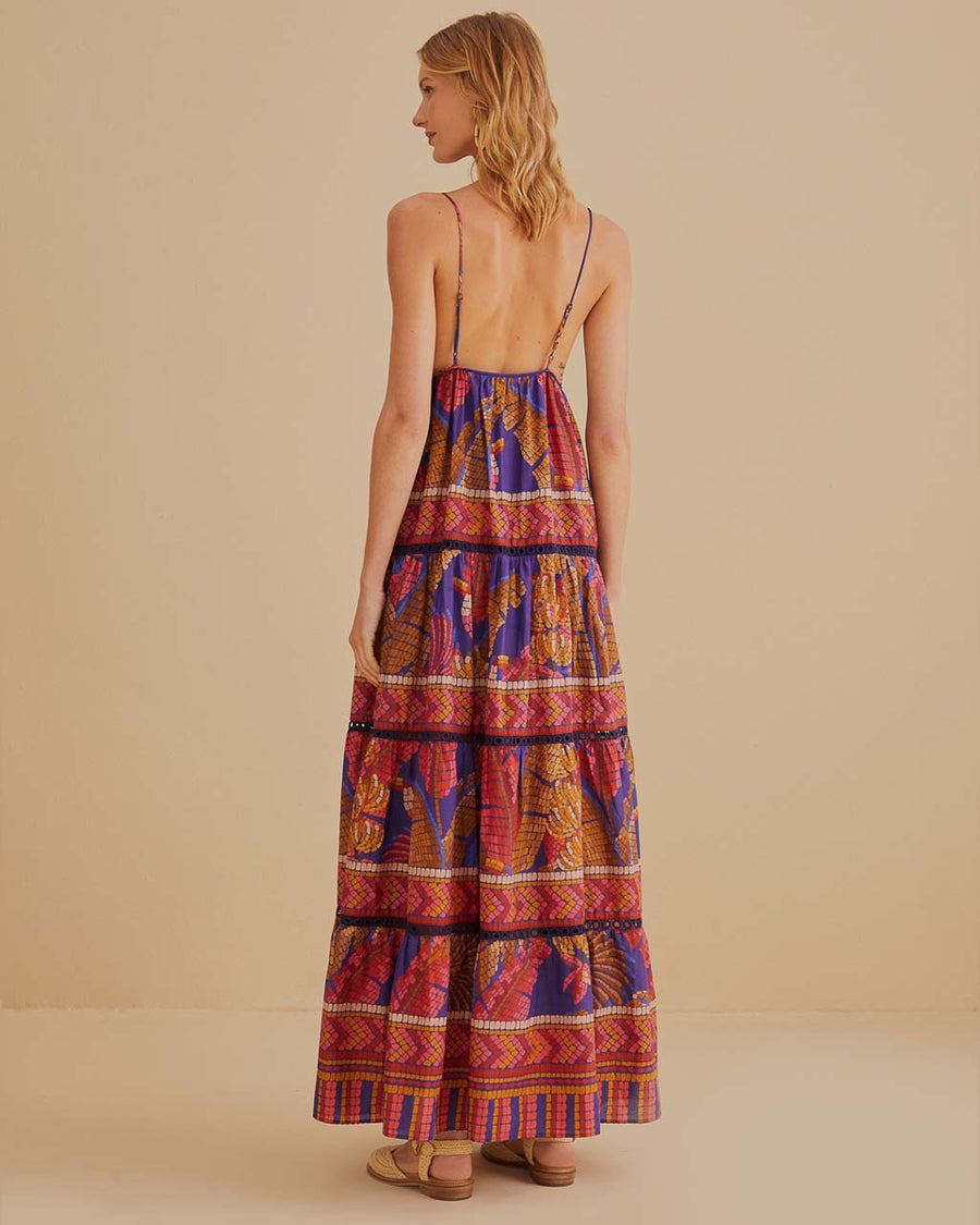 back view of model wearing blue mosaic maxi dress with deep v neckline and pretty embroidered detail