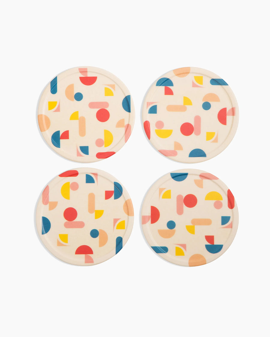 Poketo has added this cheerful and durable coaster set in their Colorblock design to their crazy popular line of bamboo tableware. New and improved with raised edges, so you can rest assured that there will be no spillage of liquid.