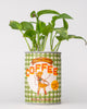 side view of green and white checkered coffee can planter with 'FIRST RODEO COFFEE' label across the front with a plant inside
