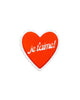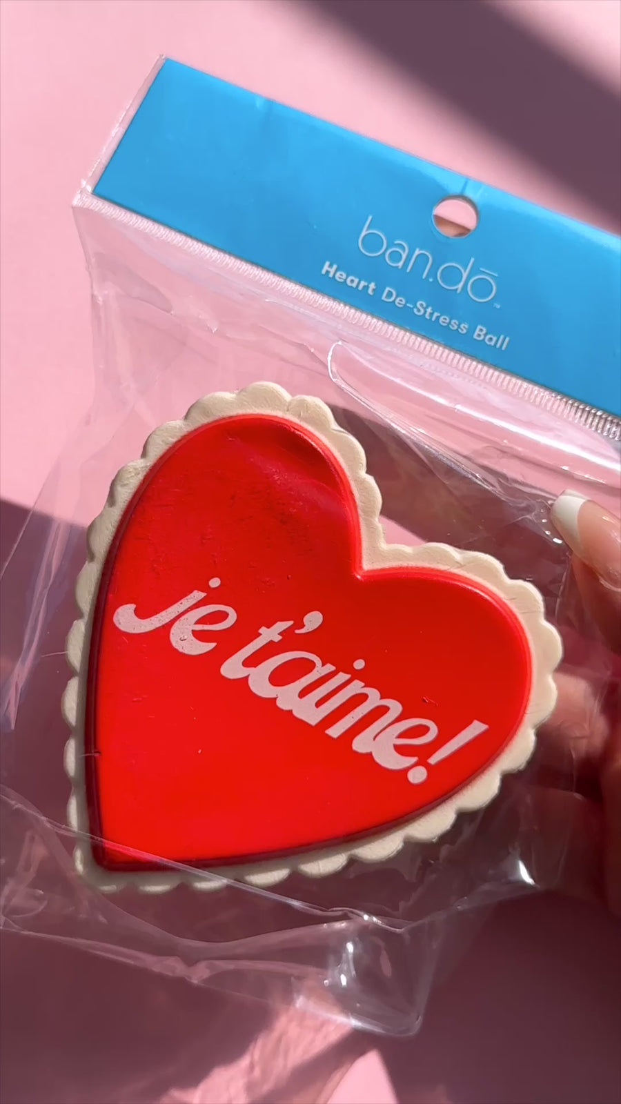 red heart shaped de-stress ball with white scalloped trim and white 'je t'aime!' across the front