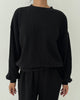 model wearing black colored waffle sweatshirt with slight balloon sleeves