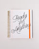 white lined paper large 12-month planner with cursive 'ready for anything' font and orange elastic closure