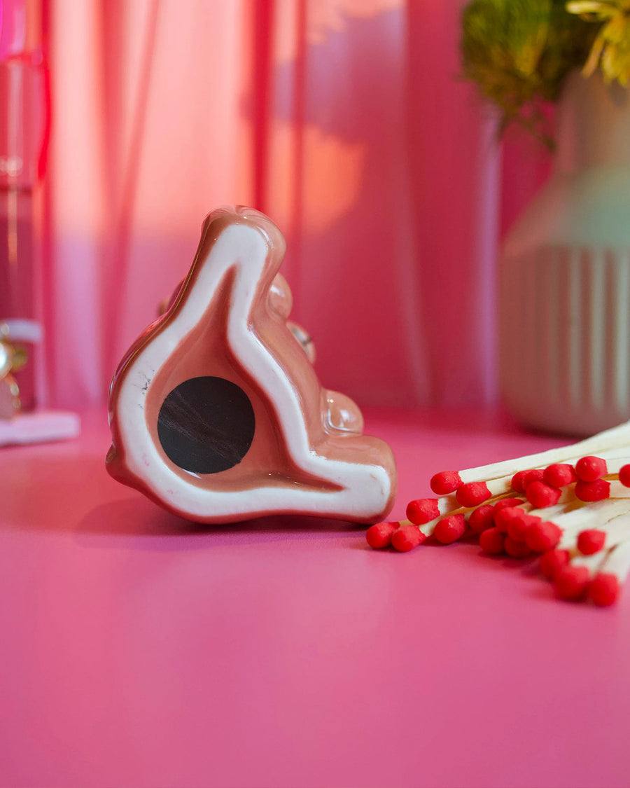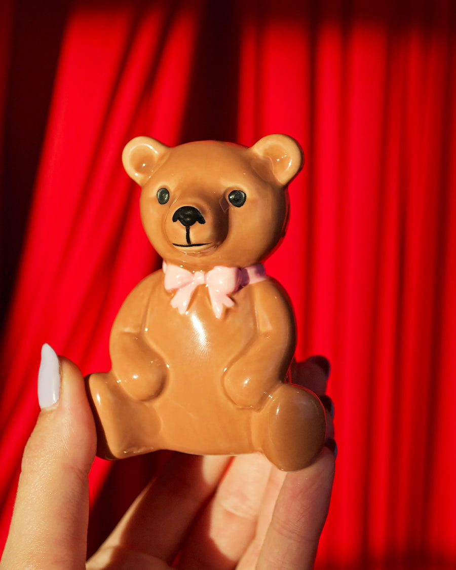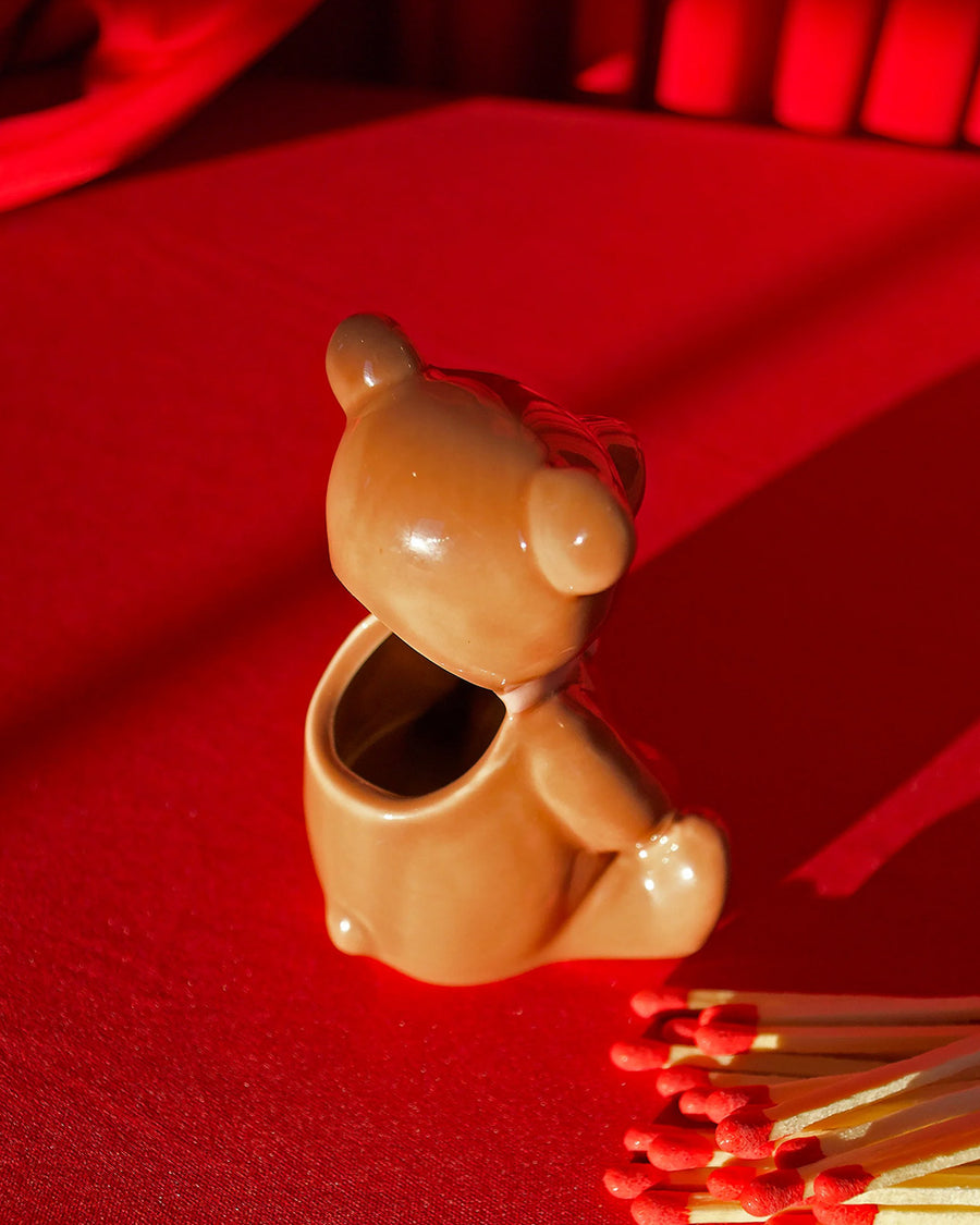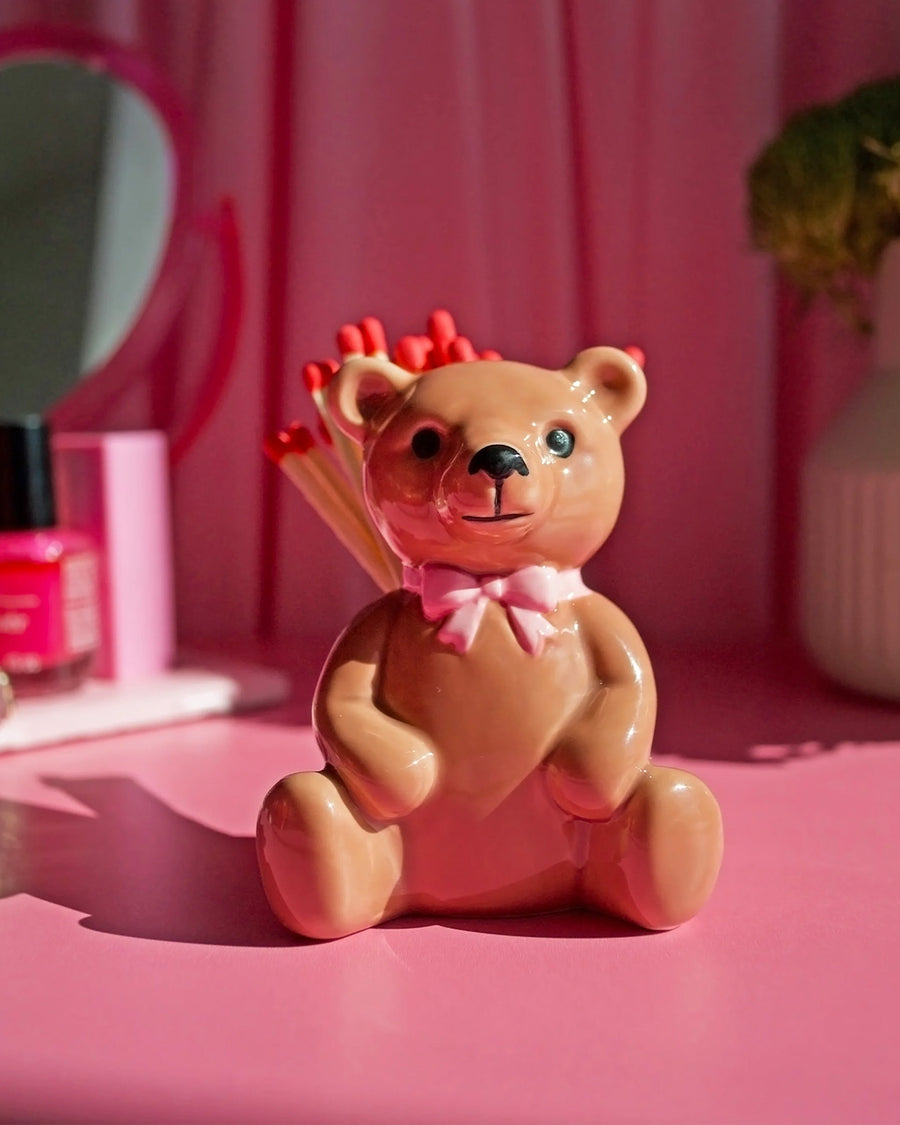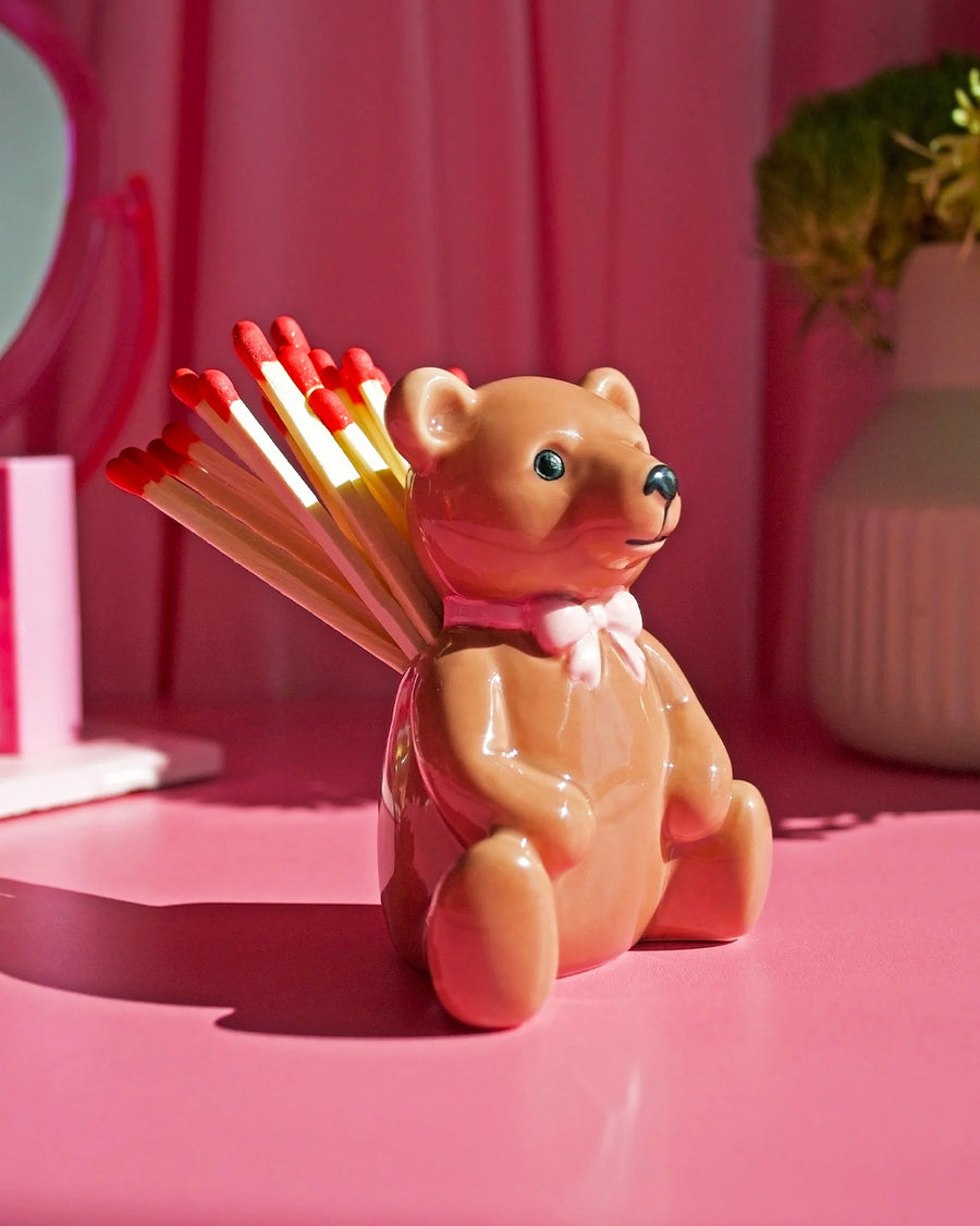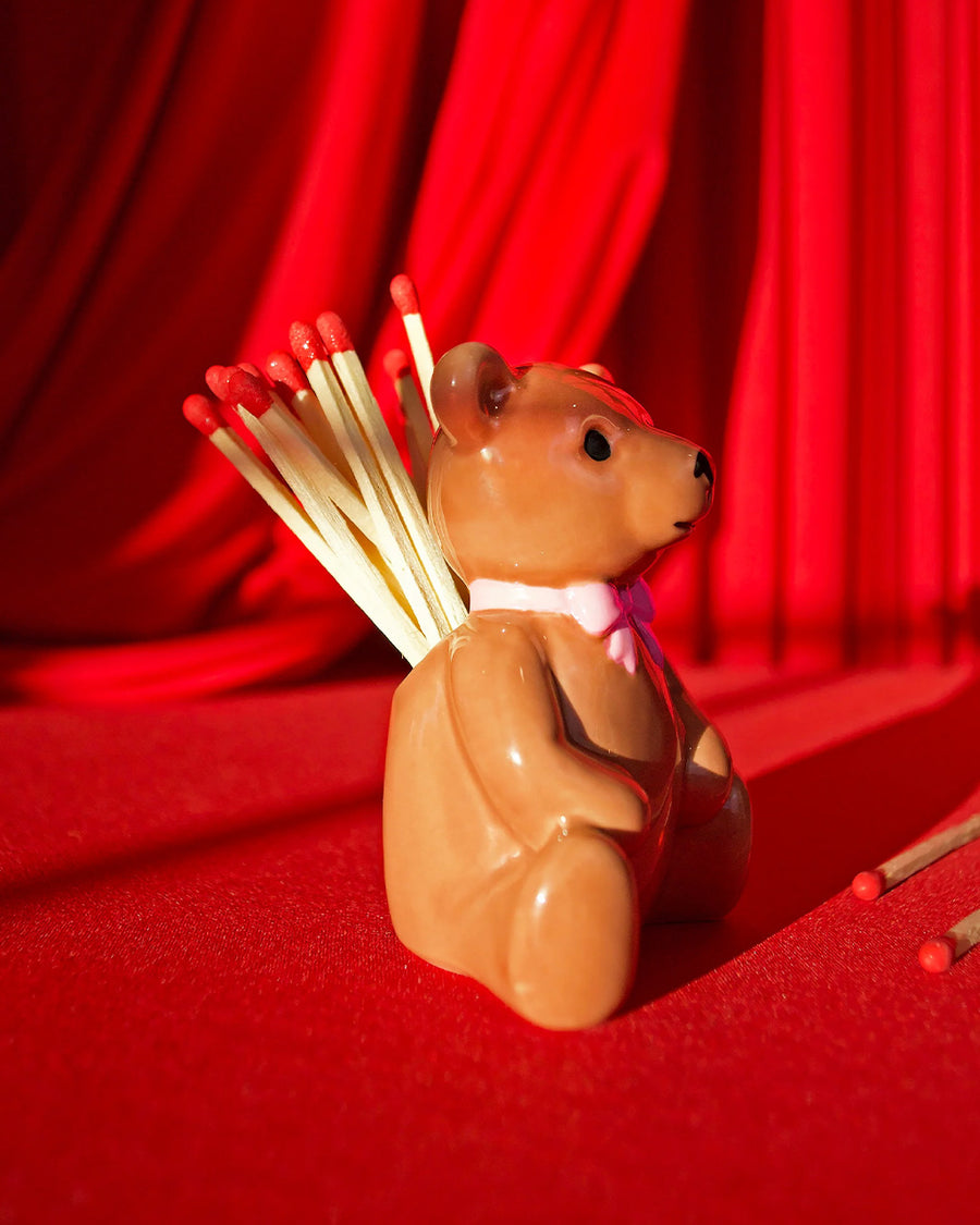 This striker is shaped like the cutest little bear you've ever seen! Comes with 25 matches measuring 3.75" each, stored conveniently inside the bear! When you need a light, tilt it over and strike a match on the base! Looks great on a desk, coffee table, shelf, etc! Also makes a cute tiny vase for tiny flowers :