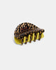 double sided hair claw: translucent brown with black dashes and lime green/yellow reverse side
