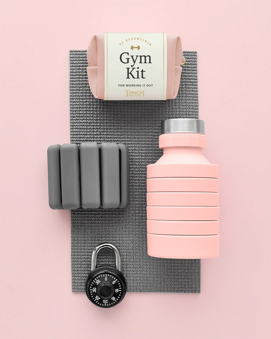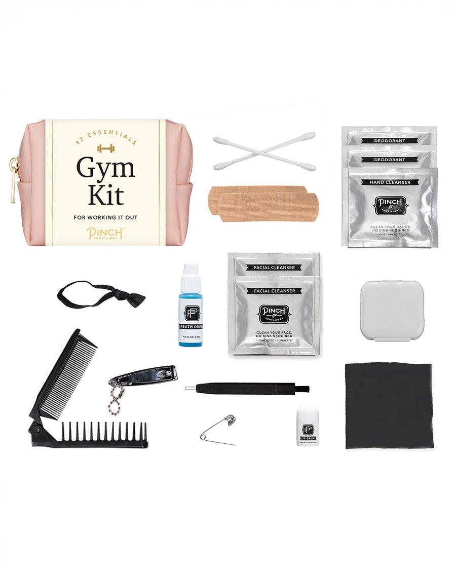 The Gym Kit contains 17 essentials for working it out: adhesive bandages (2), deodorant towelettes (2), nail clipper, facial cleaning towelettes (2), cooling wristband, lip balm, blister balm, earbud cleaning tool, pill container, safety pin, hair tie, folding brush/comb, breath drops, and a hand cleaning towelette.