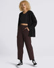 model wearing black relaxed cardigan with eyelash texture and brown pants