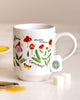 model holding white ceramic coffee mug with colorful wildflower botanical print