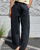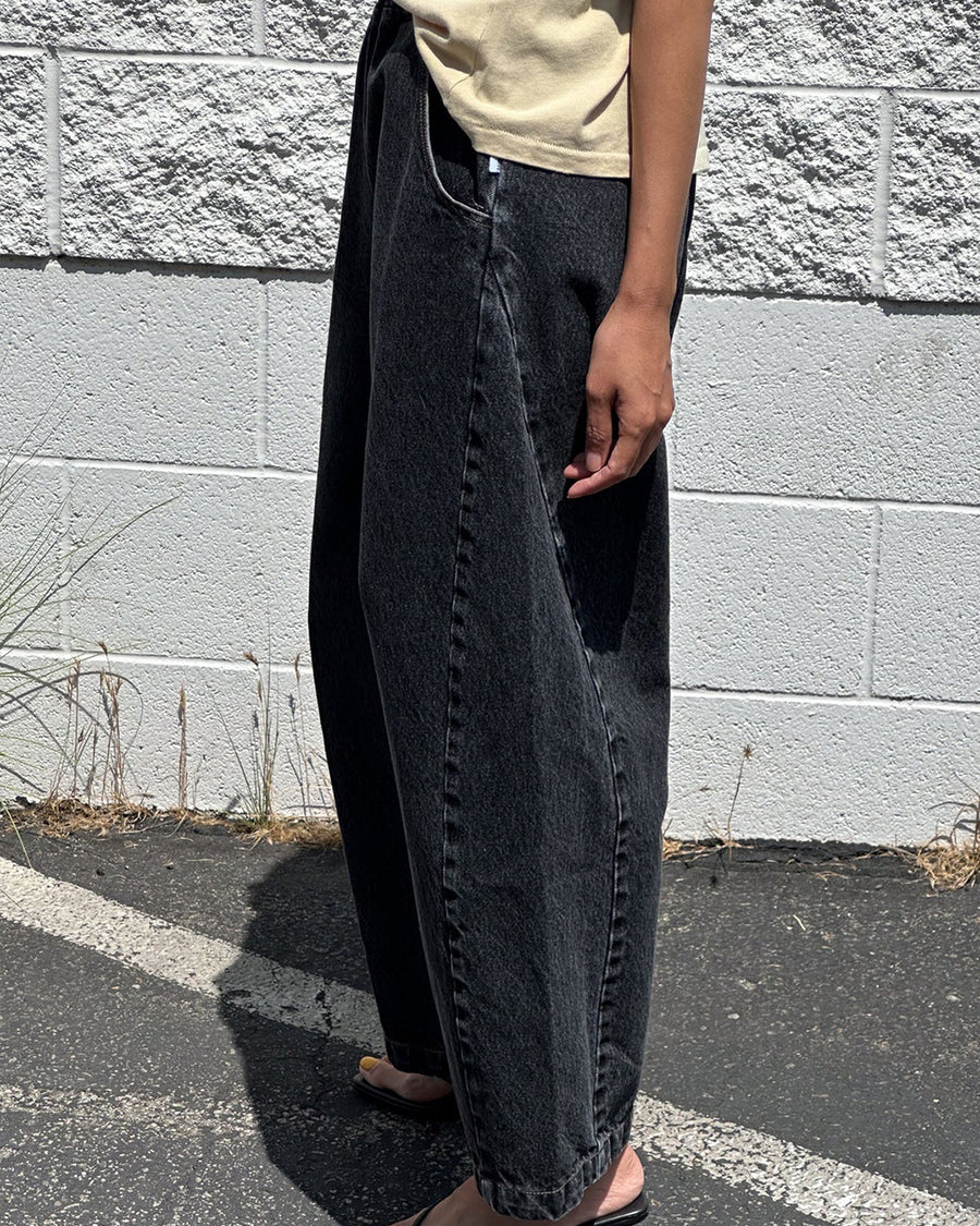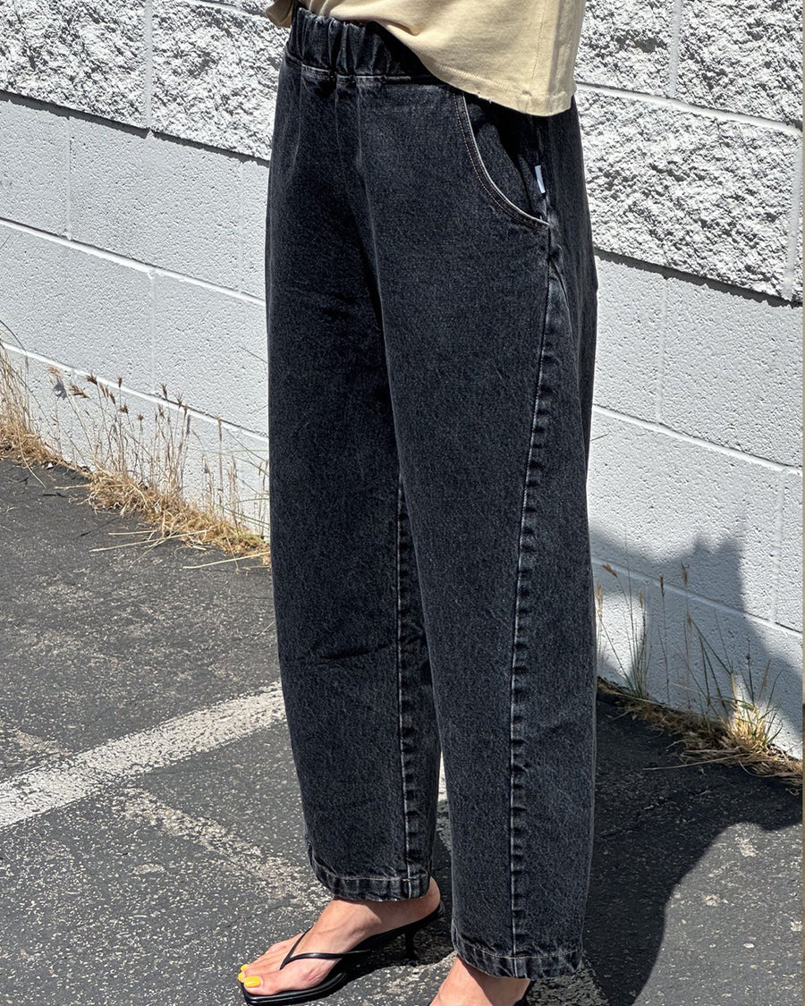 side view of model wearing washed black arc pants with elastic waist, pockets, and barrel legs