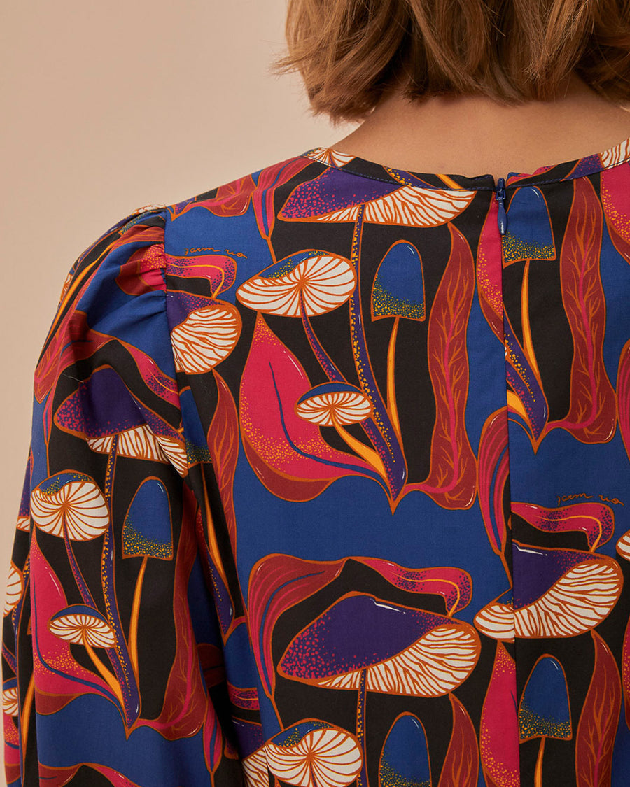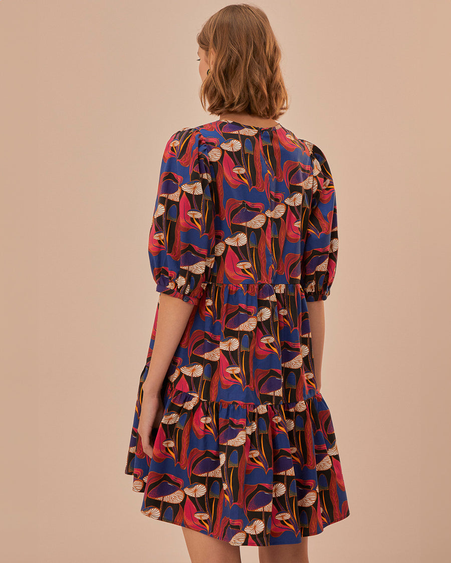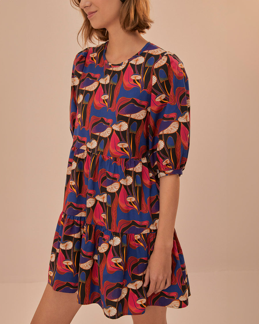 Embark on a whimsical journey with the Wild Mushrooms Black Puff Sleeve Mini Dress from FARM Rio. This charming piece captivates with its intricate mushroom motif splashed across a deep black backdrop, embracing hues of radiant red, soft beige, and vibrant blue. The playful puff sleeves complement the round neckline, while the gathered waist cascades into a flirtatious ruffled hem, creating a silhouette that dances with each step. Embrace the enchantment of nature's hidden treasures with this delightful creation.