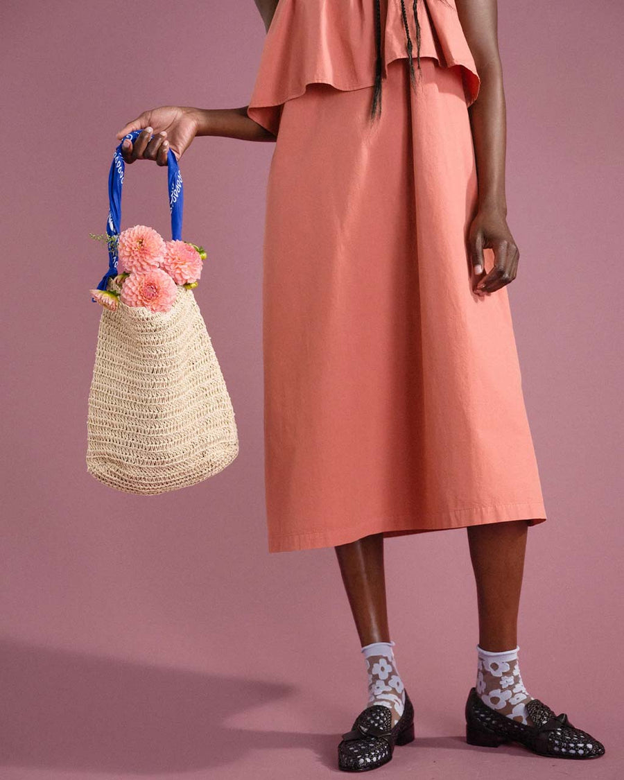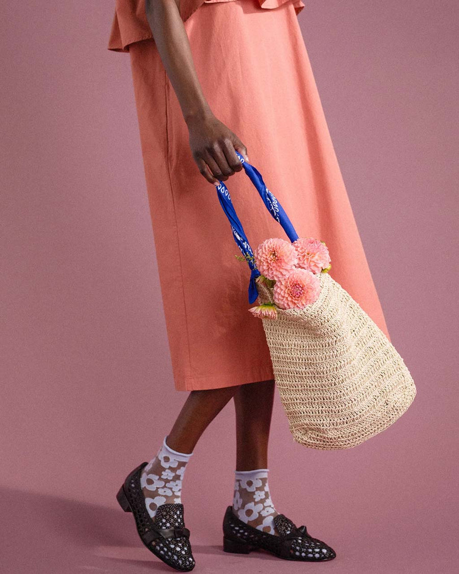 Introducing Hansel From Basel’s new raffia bags! Because they’re a warm weather staple, of course! This one has a bandana-print cotton handle so it’s extra easy on your wrists and shoulders. Perfect for a picnic in the park or a nap at the beach!