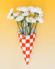 red and white checkered fair bag vase with flowers inside