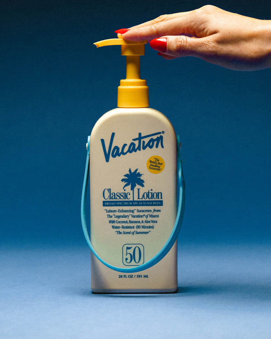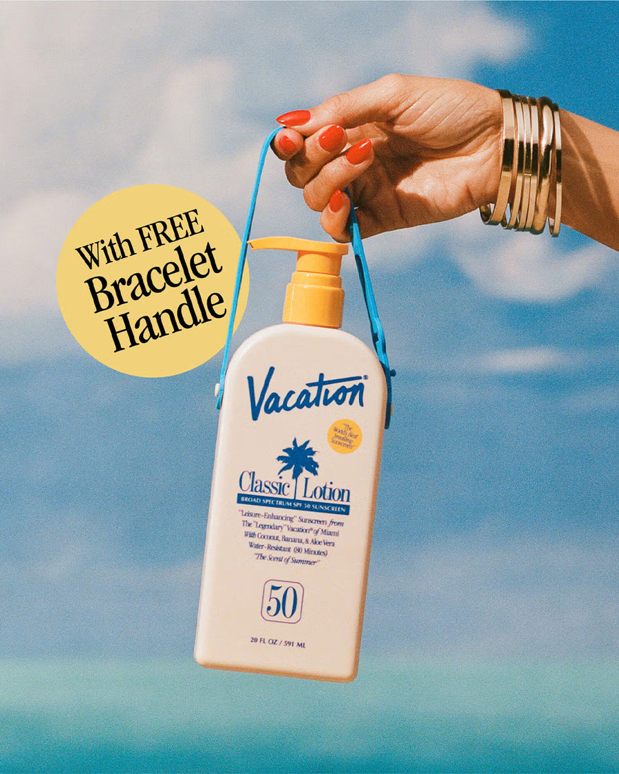 A value-optimizing 20 fl oz bottle of “The World’s Best-Smelling Sunscreen.” Featuring a deluxe PowerPump™ applicator for high-speed application and a detachable handle that repurposes into a Vacation® “Honorary Employee” Bracelet — the perfect accessory for every leisure professional.