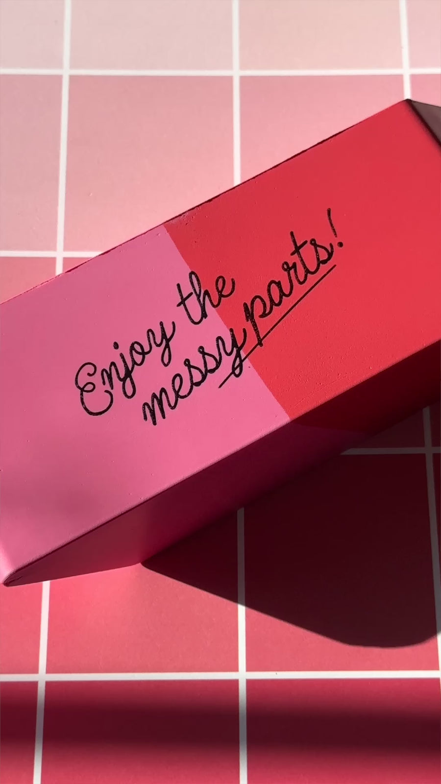 pink and red eraser shaped de-stress ball with black 'enjoy the messy parts' across the front