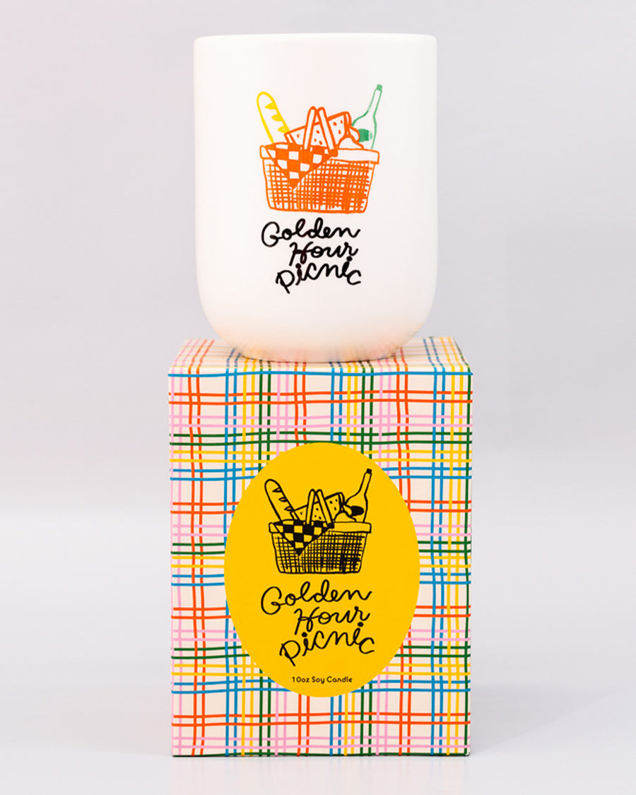 Scents that just make sense. This candle features a ceramic vessel, colored wax, and apple + berries scent—reminiscent of a picnic at sunset.