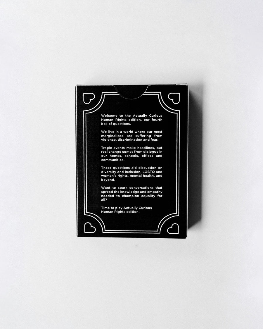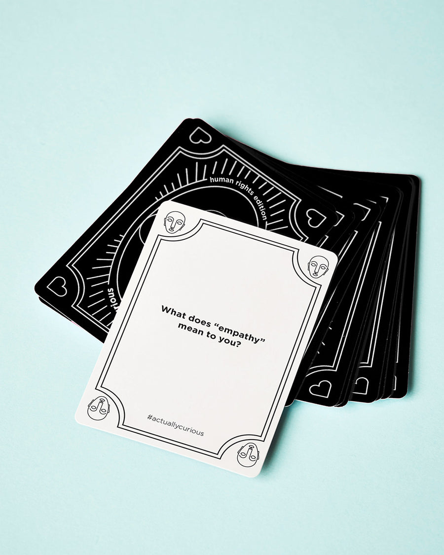 A card game and a mission to spread empathy, Actually Curious helps players build connections through meaningful questions. The Human Rights Edition is the perfect companion for exploring the important topics facing our society and our lives including social justice, mental health, environmental sustainability, and more.