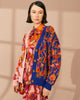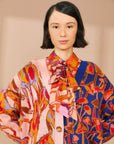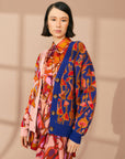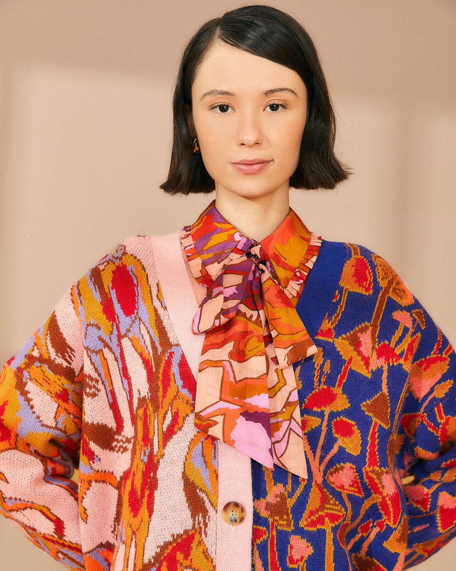 model wearing split cardigan with blue abstract mushroom print and red, blue and black wavy print