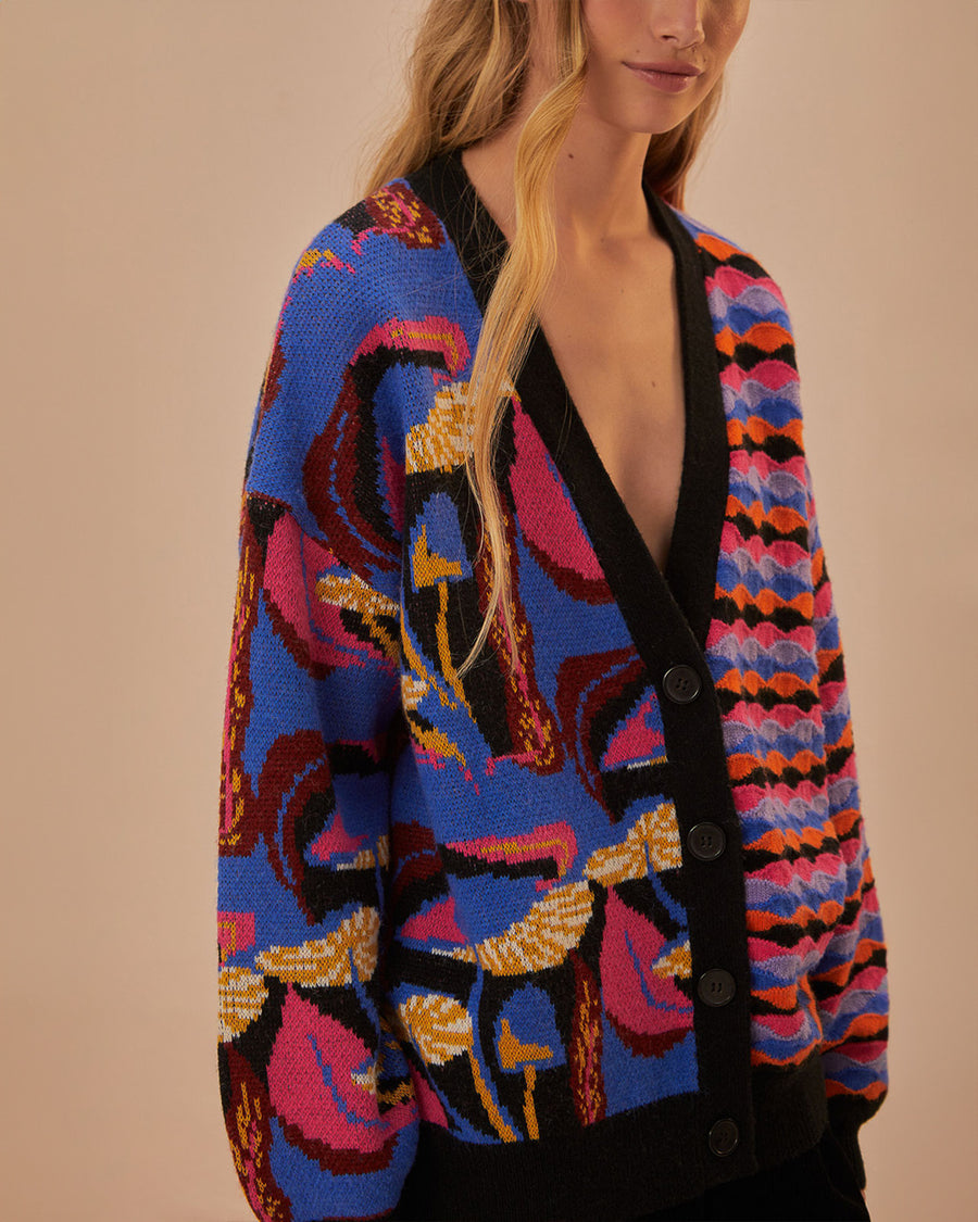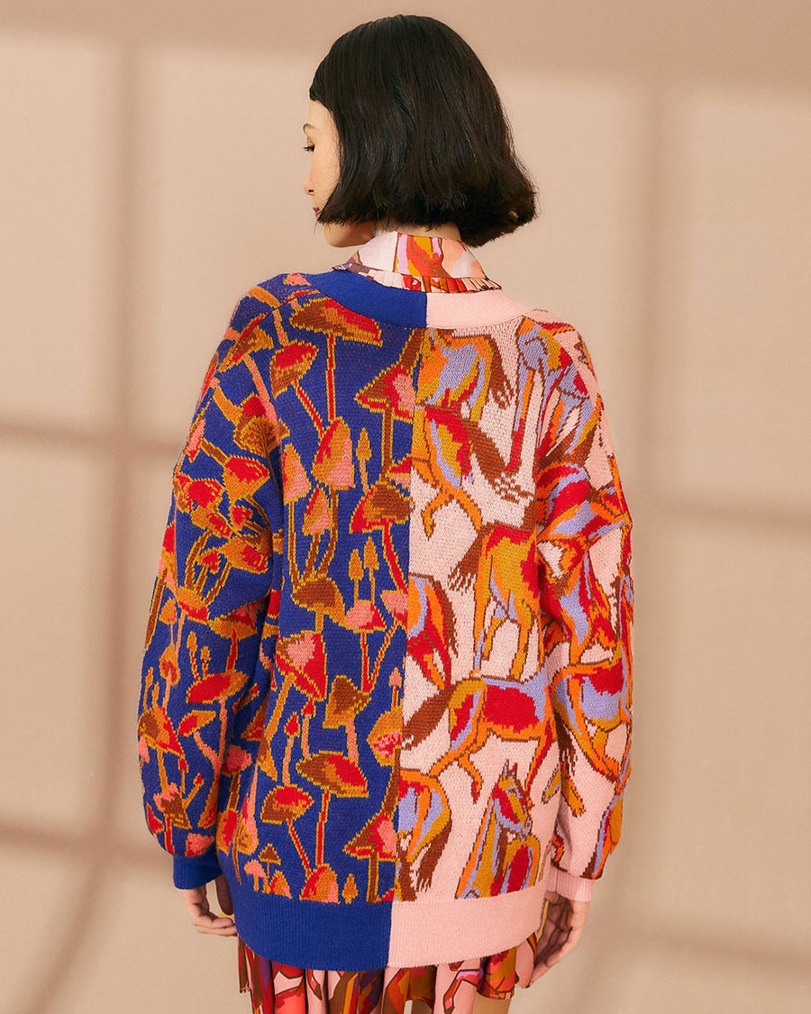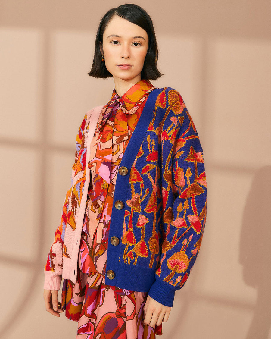 Embrace playful elegance with the Mixed Mushrooms Knit Cardigan from FARM Rio. This unique piece charms with its vibrant clash of blue and red waves, dancing around enchanting mushroom motifs. A relaxed fit with a deep V neckline invites a touch of easy sophistication, while the contrast ribbing at the cuffs and hem adds a cozy finish. Perfect for layering, it's a whimsical yet chic addition to any wardrobe.