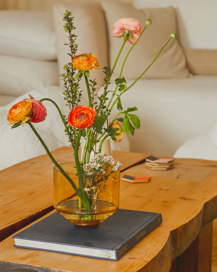 amber cylinder shaped vase with a plant in it