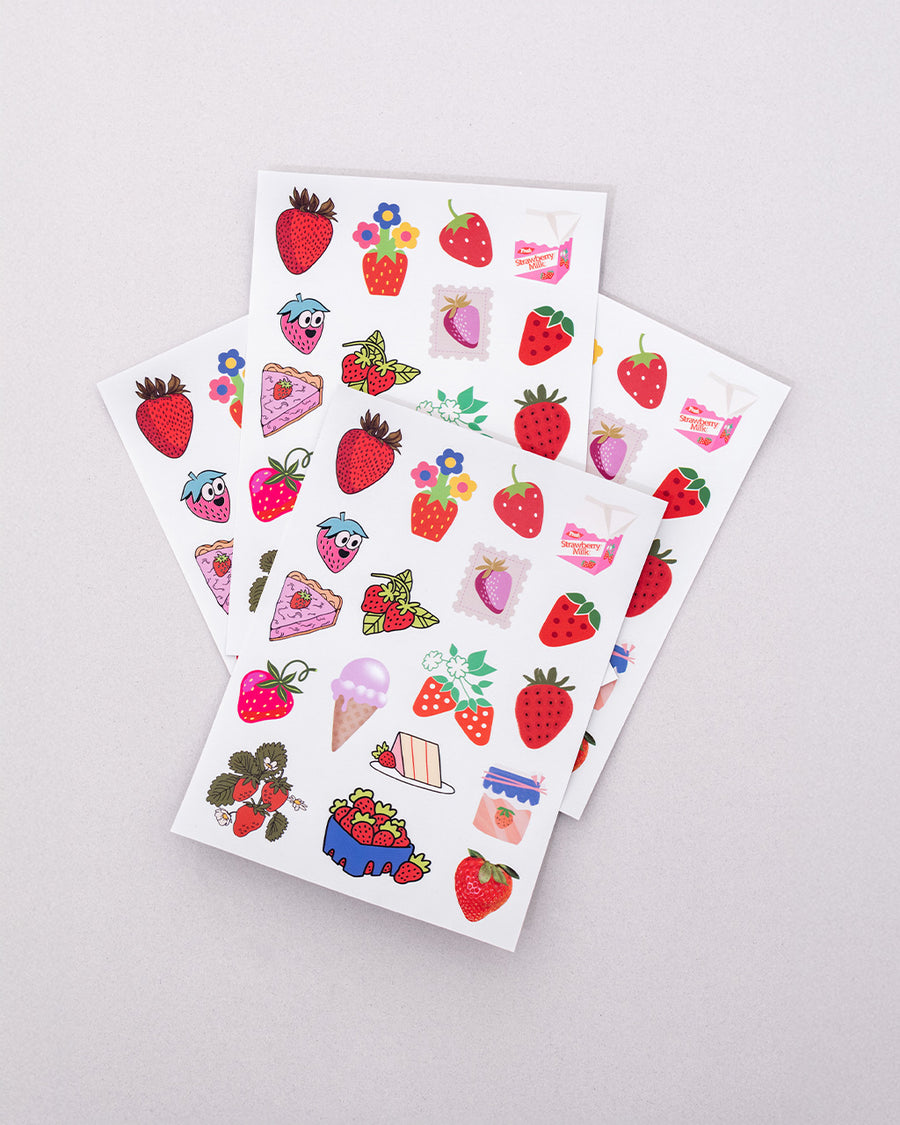 packaged set of 4 pages of strawberry themed stickers with a strawberry scent