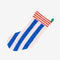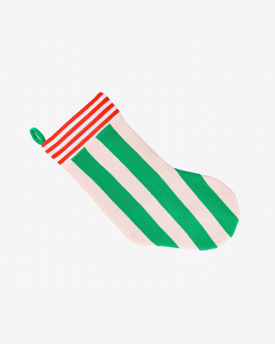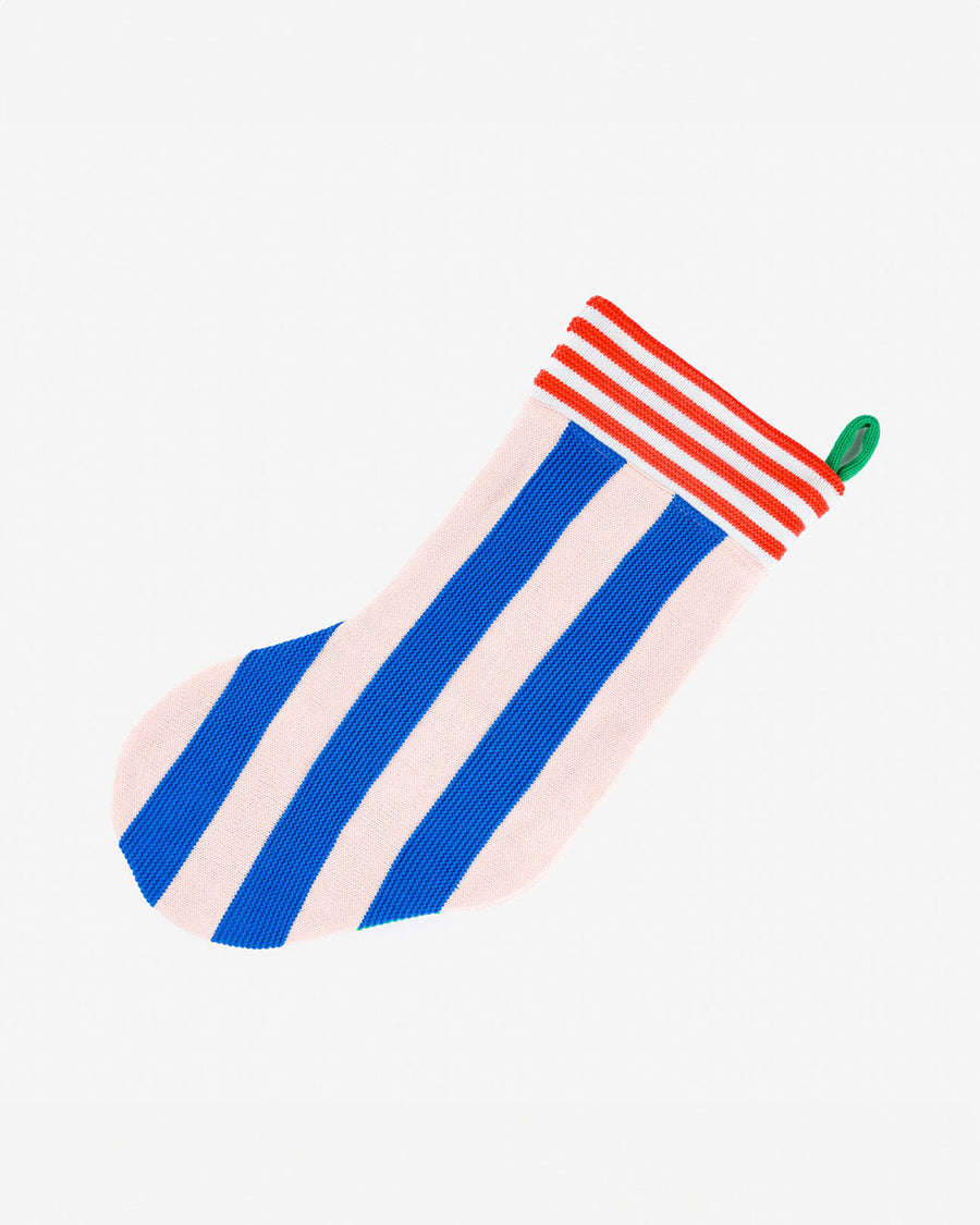Colorblock knit holiday stocking with dimensional super stripe pattern. Front and back features complementary stripe colors. Hanging loop on back. Fully lined.