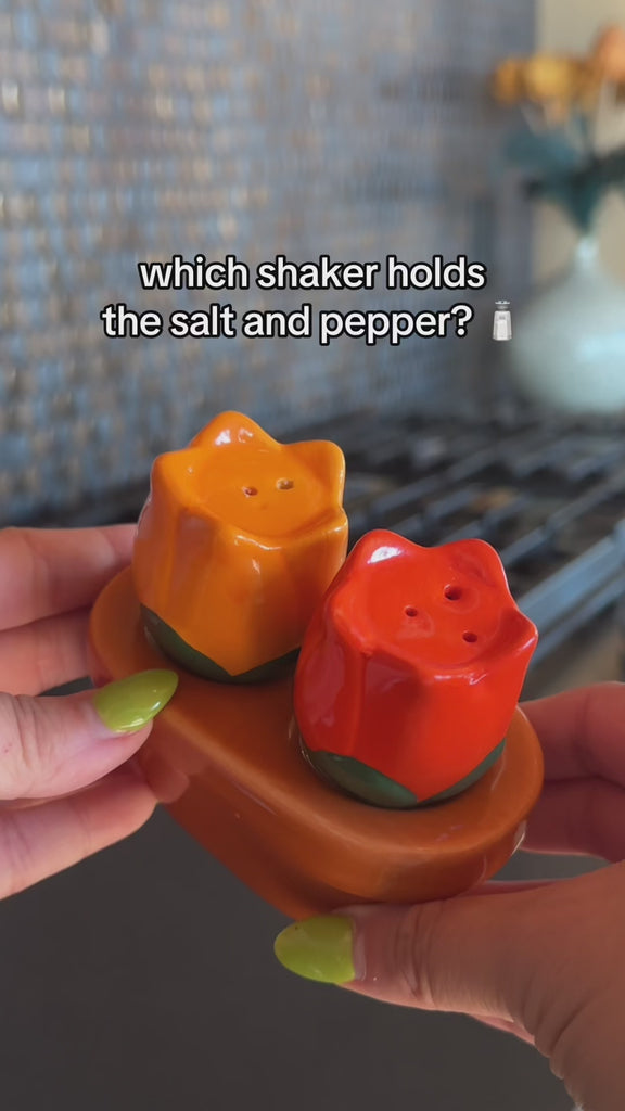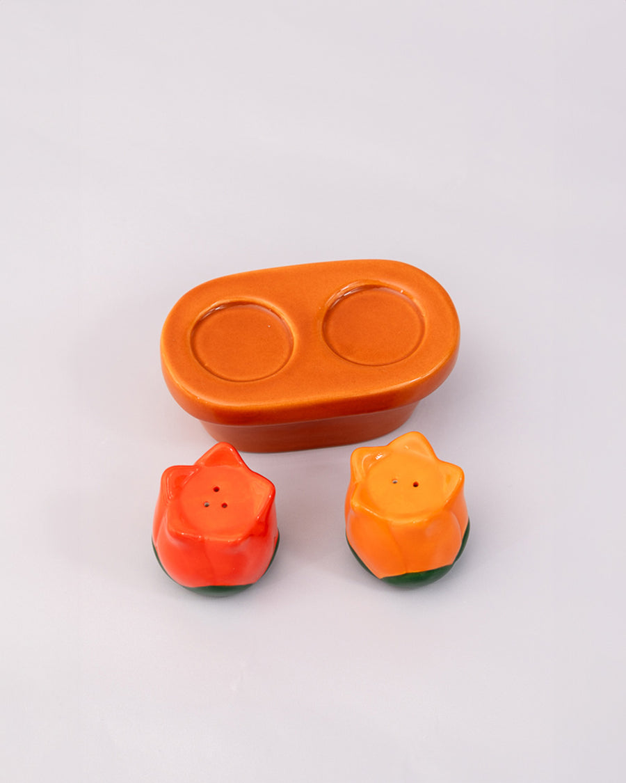 separated red and orange tulip salt and pepper shakers with brown pot tray