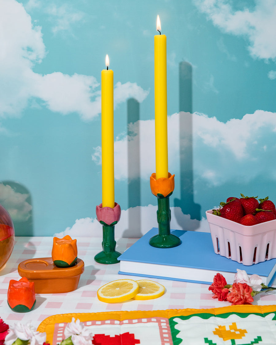 red and orange tulip salt and pepper shakers with brown pot tray on a table with candle holders, and strawberries